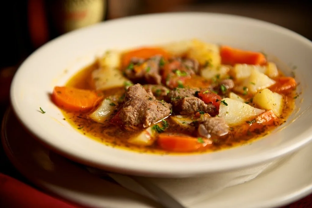 Generous chunks of seared beef cooked slowly with fresh herbs, carrots, onions and potatoes in a rich, hearty broth.